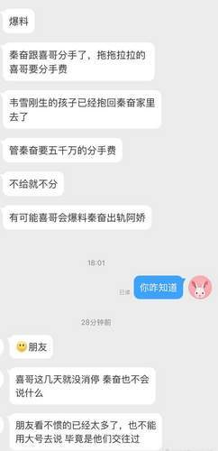 3月30日,某娱乐博主曝出喜哥的朋友用小号曝料喜哥跟秦奋要5000万分手费,而韦雪刚生的孩子已经抱进秦奋家了。网友们纷纷表示:“5000万,这辈子都不用愁了。”