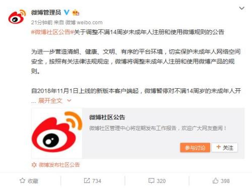 新浪微博社区管理官方微博9日发布《关于调整不满14周岁未成年人注册和使用微博规则的公告》。公告称,自2018年11月1日上线的新版本客户端起,微博暂停对不满14周岁的未成年人开放注册功能。