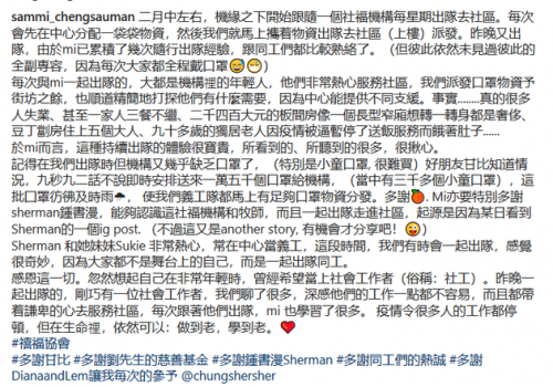 3月13日,郑秀文在个人社交网站发长文分享了自己跟随社会福利机构到社区派发口罩等物资的感受及经验,并晒出了与机构工作人员的合照。文中提到,得知机构口罩紧缺,甘比立即赠送了15000只口罩支援。