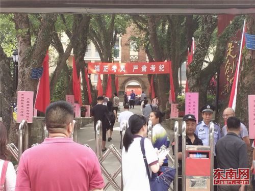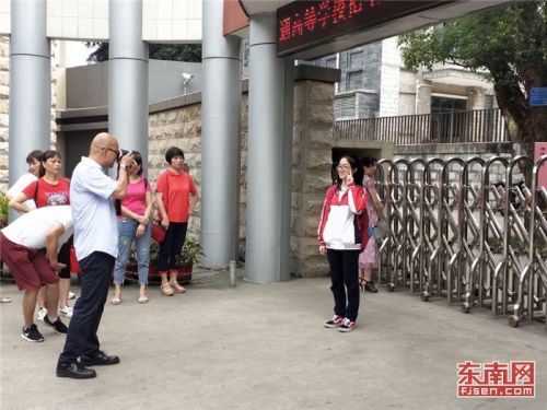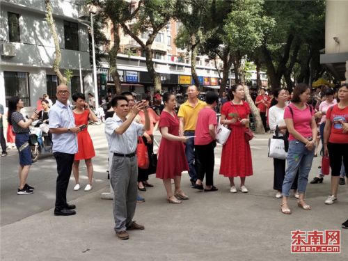 不少送考家长衣着鲜艳,祝福考生取得优异成绩,部分家长给孩子留下珍贵记录。东南网记者张立庆摄
