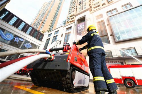 消防指战员控制灭火机器人在外围出水以控制火势蔓延