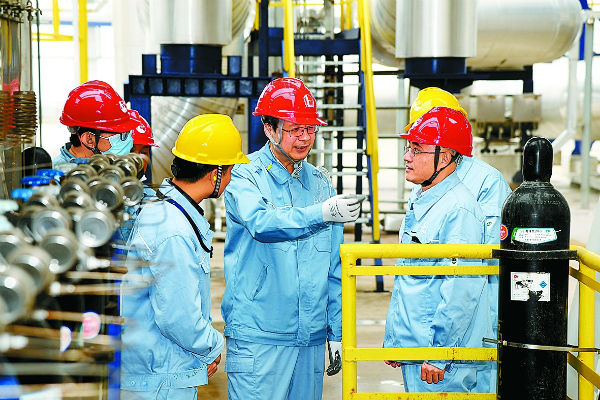 党员干部在福华气体生产装置现场进行安全观察。