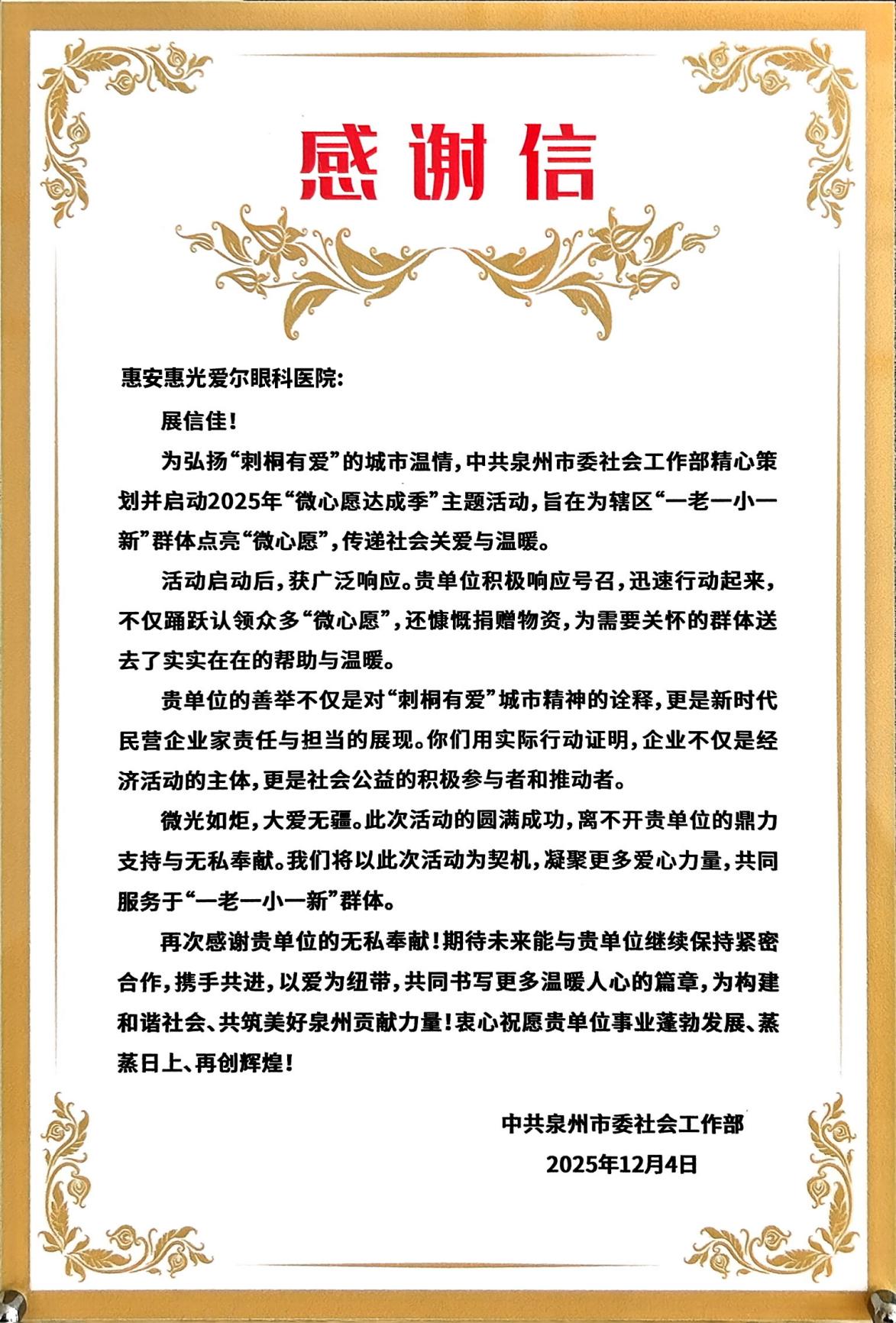 惠光爱尔眼科医院荣获市委社会工作部“感谢信”