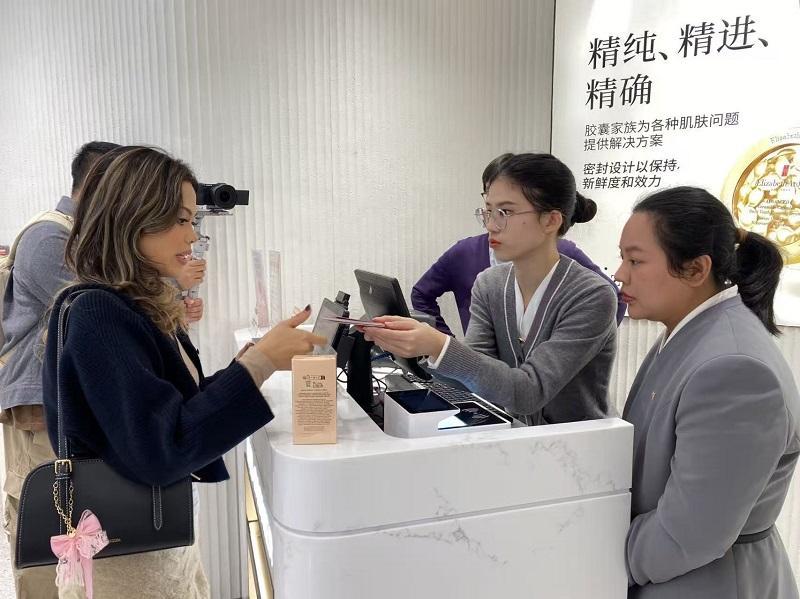 来自新加坡的游客努娜(音译)一进店就被琳琅满目的商品吸引,选购了一款心仪的身体乳,原价405元,折后仅365元,付款后拿到提货单的她满脸笑意:“价格划算,直接机场提货不占行李空间,太方便了!”这是努娜首次到访福州,她还首次用中国的移动支付购物,“不用带卡包、不用揣现金,一部手机就能轻松付款,整个流程顺畅快捷。”