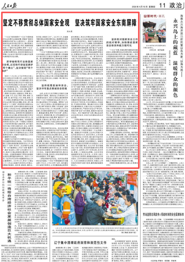 4月16日,《人民日报》第11版刊发福建省委书记、省人大常委会主任周祖翼署名文章《坚定不移贯彻总体国家安全观 坚决筑牢国家安全东南屏障》。全文如下——