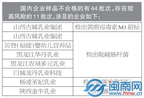 国内企业样品不合格的有44批次,存在较高风险的11批次,涉及的企业如下: