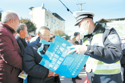 福安市开展“美丽乡村行”交通安全宣传巡回活动 福建法治报 2021-02-05 22:56 福建法治报-海峡法治在线1月18日讯 1月14日,福安市公安局交警大队民警和志愿者一起到辖区康厝乡,开展“美丽乡村行”交通安全宣传巡回活动。民警和志愿者通过自编的交通安全快板、摆放宣传展板、发放宣传资料、面对面接受群众咨询等多种形式向群众讲解冬季交通安全知识。 (林杰 摄)
