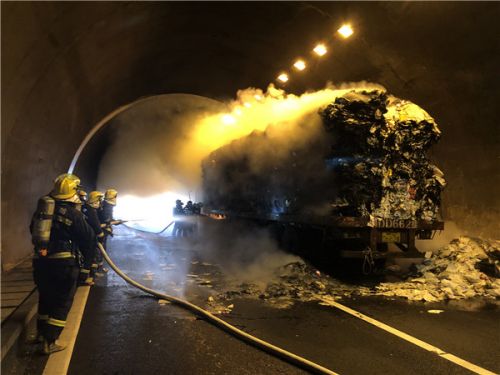 福建法治报-海峡法治在线1月27日讯 日前,高速公路龙岩市新泉镇往上杭县蛟洋镇方向豪岭隧道内,一辆载有废旧纸皮的大货车起火,所幸上杭县消防救援大队及时出警将火扑灭。