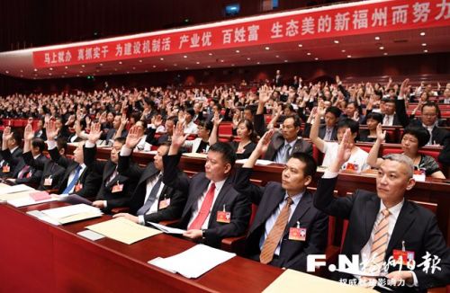 参加市第十一次党代会预备会议的代表们举手通过大会议程。