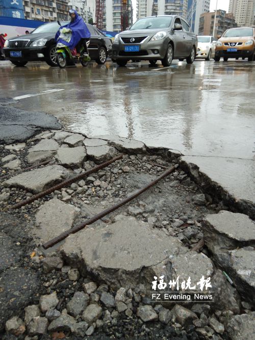 市民林先生昨日致电福州晚报新闻热线968800反映,古田路古乐路口附近路面上有多处崩裂塌陷以及大小不一的陷坑,在车辆的反复碾压下,路面出现了明显的下沉迹象,有些钢筋凸出,容易导致过往车辆爆胎,发生危险,希望相关部门能尽快修补路面,以免造成严重安全隐患。
