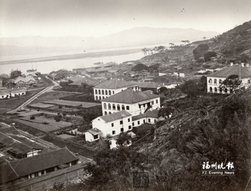 这张“全家福”照片中的船政建筑有:一号船台和船亭,洋匠房、外国教习公寓楼、船政副监督德克碑所居洋楼、外国医生公寓楼、洋员办公所、船政衙门、船政前学堂及学舍、船政正监督日意格所居洋楼、守卫船政的镇海营营区、船政后学堂及学舍。建筑依次展开,蔚为壮观。从照片中可以看出,船政是先盖学堂、师生宿舍、衙门等办公场所,后来才盖船政十三厂。