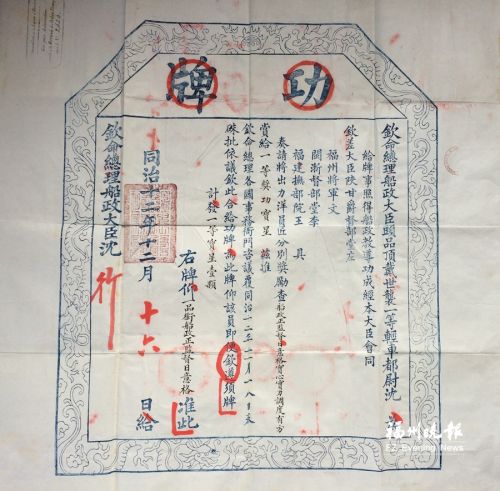 李共青在欧洲的英国、法国、德国等地四处奔波,通过访问当年船政学堂洋员的后人,先得到宝星的照片,顺藤摸瓜寻得一等宝星和二等宝星。他还与日意格的后人交朋友,找到船政大臣沈葆桢于同治十二年十二月十六颁给日意格的功牌,功牌标示“奏请将出力洋员匠分别给奖励,查船政正监督日意格实心实力,调度有方,赏给一等奖功宝星”,其中特别标出功牌是给“一品衔正监督日意格”。船政系列建筑何时具有规模?“三连张”记录十三厂建设过程