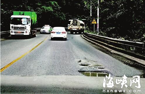 昨日,海都记者驱车沿着福飞北路往北,车子驶到福飞北路上坡的森林公园段后,路况较差,车辆颠簸明显,特别在一处拐弯的位置,有20多米的路面遍布坑洼,犹如坐过山车。记者下车沿路观察,发现沥青路面上出现了一个大坑,与地面有七八厘米的落差。