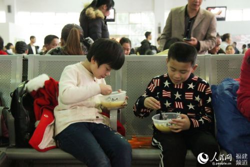 临近中午,在候车室甜甜拿起香蕉吃了起来