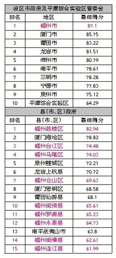 福建政府网站绩效考核结果公布 福州拿下两个第一 福州新闻网 2017-02-12 09:54 去年下半年开始,省政府办公厅组织开展了2016年全省政府网站绩效考核。考核涉及政务公开、网上办事、互动交流、新技术应用、网站性能维护及保障机制等多个方面。近日考核结果公布,福州市位列九地市及平潭综合实验区第一名。此外,全省83个县(市、区)排名中,福州有9个进入全省前15名,鼓楼更是排名第一。(福州日报记者) 2016年度全省政府网站绩效考核结果: