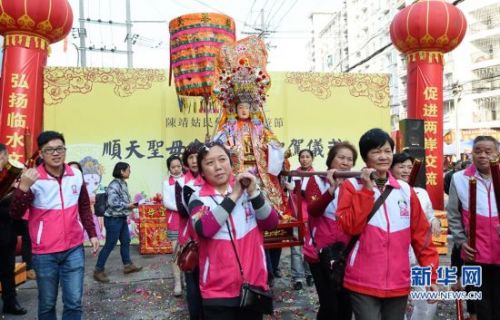 当日,来自海峡两岸的陈靖姑信众在福州举行顺天圣母金身赴台起驾仪式,随后护送顺天圣母金身搭乘“海峡号”客轮直达台北旅游节主会场,参加在台北、宜兰等地举行的系列交流活动。