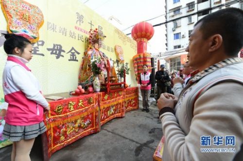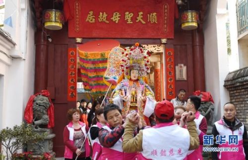 2月22日,两岸信众将陈靖姑金身从福州故居抬出。