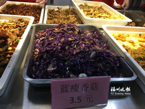 昨日记者在该校东区教工食堂看到了摆在最前排的“蓝瘦香菇”,食材主要是紫甘蓝、瘦肉和香菇,标价3.5元,许多人前去品尝。食堂经理黄先生是新菜的“发明者”。他说,此举并非只是赶潮流,因为紫甘蓝有防癌功效,有助疏通血管,香菇也有保健功能,搭配瘦肉后,营养价值不错。(记者 黄丽汀 文/摄)