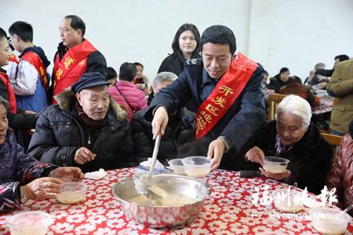 昨天上午,马尾闽安村老人活动中心热闹非凡,400多位老人齐聚一堂。11时许,一盆盆热气腾腾的拗九粥和咸粥端上了桌面,市、区领导为现场90岁以上的老人盛上了一碗碗爱心粥,并向他们送去了节日慰问金,祝愿他们节日快乐。