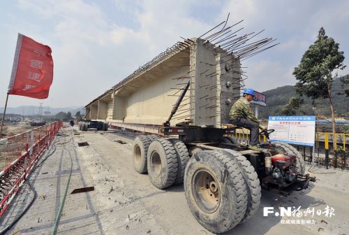 在山兜高架桥施工现场,专用工程车正运送预制梁。