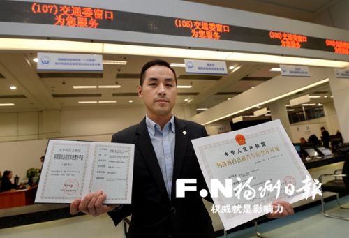 昨日下午5时许,在市行政服务中心交通委窗口,神州专车福州分公司钟经理从工作人员手中接过编号为001的网络预约出租车经营许可证(如图),这是我市颁发的首张网约车平台经营许可证。