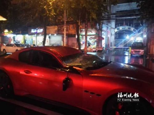 事发后,福州晚报记者在现场看到,这辆玛莎拉蒂车停在机动车道上,前挡风玻璃严重受损,车顶凹陷,旁边一根水泥杆倒在地上,不远处,一辆工程车载着一辆挖掘机停在现场。