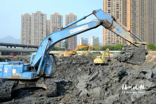 大型机械清挖经过固化的淤泥。
