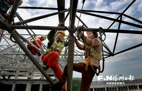 昨日,长乐国际机场第二轮扩能项目迎来新突破:扩能航站楼主体钢结构施工顺利封顶,转入下一阶段装修工序。作为“攻坚2017”重要项目之一,与原定工期相比,该工程主体钢结构封顶提前了35天。