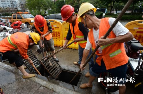 昨日下午3时许,金洲南路锦江都城酒店门前,4名身穿橙色工作服、头戴安全帽的水务管网公司工作人员正在清掏排水口周边的树叶和其他垃圾。“天气预报说还会有降雨,我们要提前做好准备,确保排水通畅。”工作人员说。(记者吴隽 孙漫 叶义斌 摄影报道)