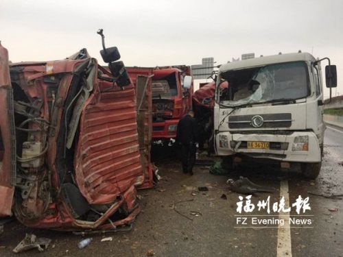 福州新闻网4月22日讯(福州晚报记者 王威 陈曦 黄绿荣 张嘉圣)昨日5时许,三环路淮安大桥往新店方向的车道上五车刮碰。三辆大货车和一辆垃圾运输车几乎并排挤压在一起,另一辆大货车停在稍远处,其中一辆货车被挤得车头变形,一名驾驶员受伤被困。仓山区金祥消防中队官兵到场救出被困司机,这名司机大腿受伤。