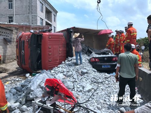 闽侯一货车侧翻碎石倾覆压扁小车 车上两人被困