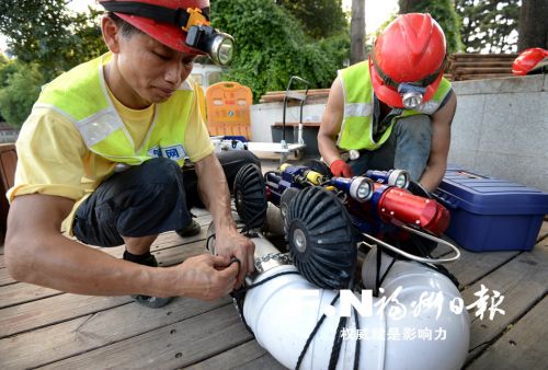 工作人员将管道内窥检测仪捆绑在浮漂上放入管道内进行检查。