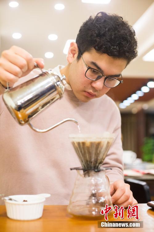 为了吸引更多顾客,也里学习了咖啡拉花技巧。他用奶泡在咖啡中勾勒出爱心、叶子等形状,受到了大学生们的欢迎。李南轩 摄