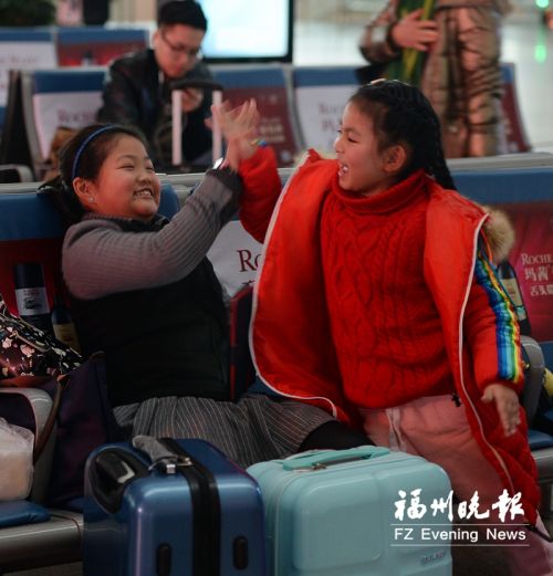 候车间隙,两个女孩正在嬉戏。
