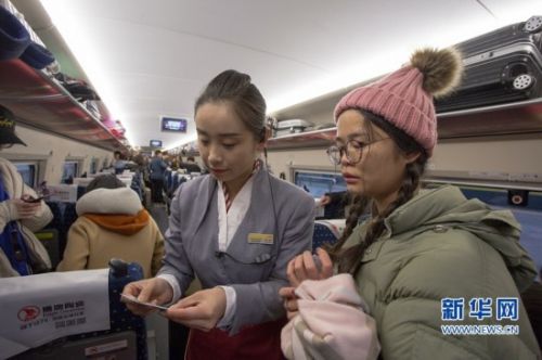 1日上午8时42分,从福州开往昆明的G1698次列车上,“高姐”胡娜正在查验车票。新华网 肖和勇 摄