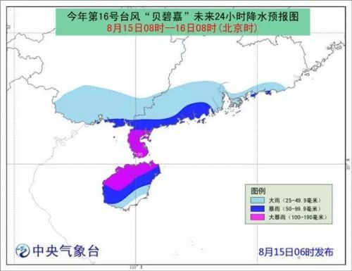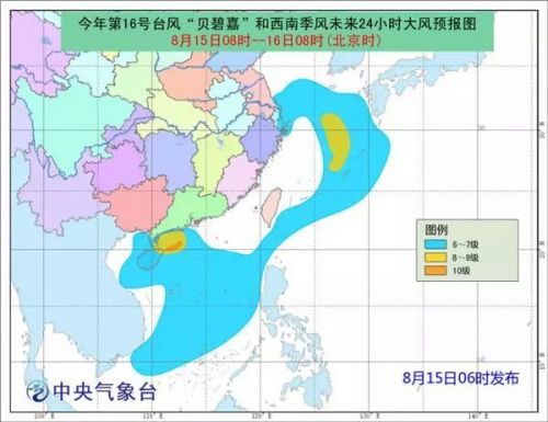 与此同时,受“贝碧嘉”和西南季风的共同影响,8月15日08时至16日08时,南海大部、琼州海峡、北部湾东部海域、巴士海峡、台湾以东洋面、东海大部、黄海南部,以及广东中西部沿海、海南岛及其沿海、广西沿海将有6-7级大风,阵风8-9级,其中南海西北部部分海域、广东西部沿海和海南岛东北部沿海将有8-9级大风,部分海域或地区风力可达10级,阵风11-12级。