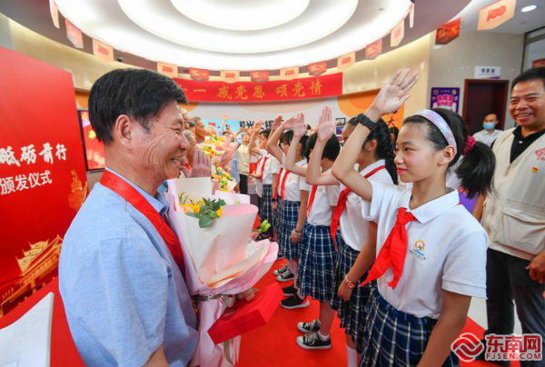图为少先队员向老党员献花。福建日报记者 游庆辉 摄影报道