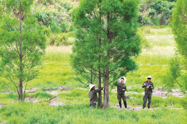 目前,黄雍容团队已六次来到甘厝村,对每棵水松进行实地调查(上图),为水松群落建立档案及数字化监测保护管理体系。