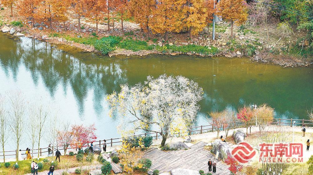 近日,在福州市晋安区九峰村,树叶染上斑斓色彩,与澄澈碧绿的湖水相映成趣,勾勒出如诗如画的冬日景致,引得游客拍照留念。