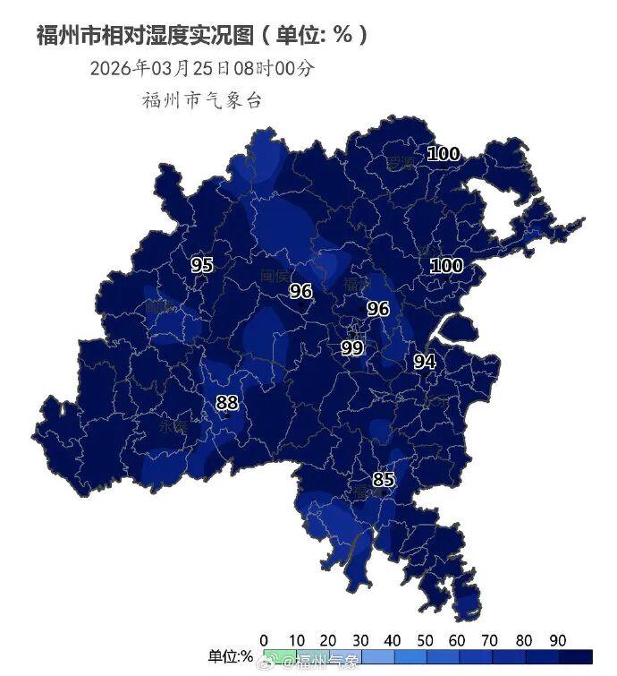 25日清晨福州主城区的相对湿度依旧达到100%,空气达到饱和状态,多余的水汽凝结后形成了雾,直到阳光穿透云层,雾气逐步消散。近期出行多关注能见度变化,注意交通安全。
