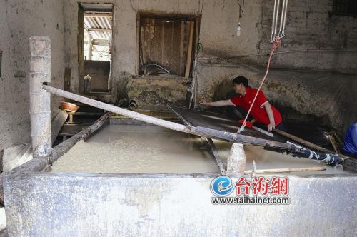 张子辉说,制作土纸的竹麻,必须用刚开始长叶的竹子,用石灰腌制一年左右才能用。走进造纸作坊,张子辉正在搅动着竹麻料,经水管通向大缸里。而后,经过沉淀、制浆处理植物纤维的水悬浮液,初步脱水、压缩、烘干制成土纸。