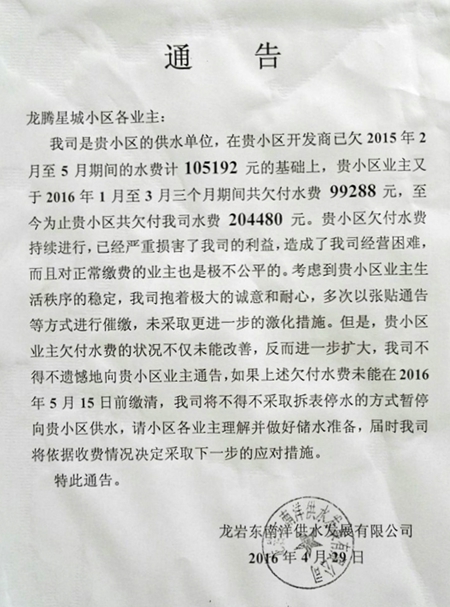 5月9日上午,闽西新闻网记者来到位于龙工路附近的龙腾星城小区,在一宣传栏上看到张贴的一张A4纸,《通告》写道,龙腾星城小区各业主,我司是贵小区的供水单位,在贵小区开发商已欠2015年2月至5月期间的水费计105192元的基础上,贵小区业主又于2016年1月至3月三个月期间共欠付水费99288元,至今为止贵小区共欠付我司水费204480元。贵小区欠付水费持续进行,已经严重损害了我司的利益,造成了我司经营困难,而且对正常缴费的业主也是极不公平的……,如果上述欠付水费未能在2016年5月15日前缴清,我司将不得不采取拆表停水的方式暂停向贵小区供水……,落款单位为龙岩东南洋供水发展有限公司,时间为2016年4月29日。