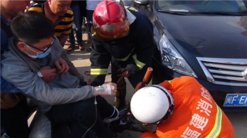 5月12日15时,在龙岩市新罗区西陂大洋小学路口发生一起交通事故,一辆小轿车与摩托车发生碰撞,摩托车上的钢质支腿刺穿了摩托车司机的左小腿。接警后,新罗消防大队官兵迅速到场救援。