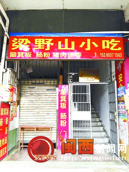 5月24日下午,闽西新闻网记者来到现场看到,原来通往楼下的通道确实变成了“店铺”,只见“店铺”卷闸门紧闭,门前放了一张桌子,店牌写着“梁野山小吃 簸箕米反 肠粉 猪肉汤等”字样。而在楼梯背后,卷闸门则开着,小小的空间堆放着很多东西。