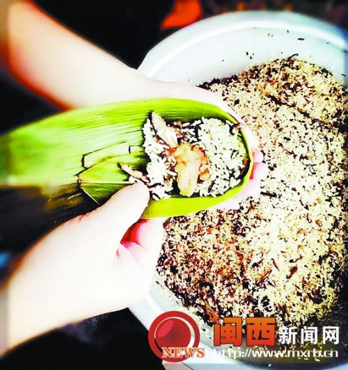 图为近日一主妇在家包粽子。