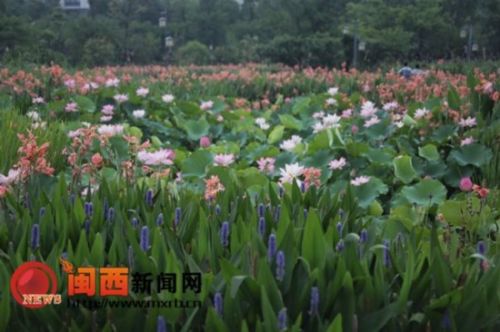 近日,龙岩中心城区石锣鼓湿地公园姹紫嫣红,百花齐放,美人蕉、荷花、鸢尾、再力花等竞相开放,市民在公园散步,仿佛置身花海中。