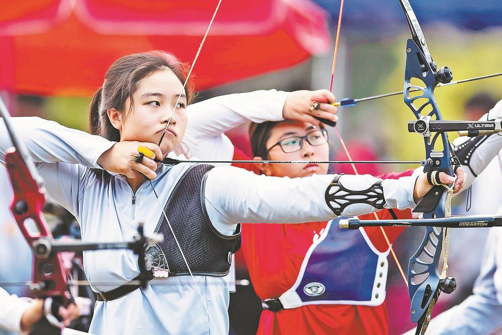 赛场上,运动员们搭弓引箭,期待射中梦想的靶心。