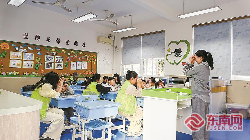 课堂上,低年级的学生在做眼保健操,穿着绿马甲的是陪读家长。