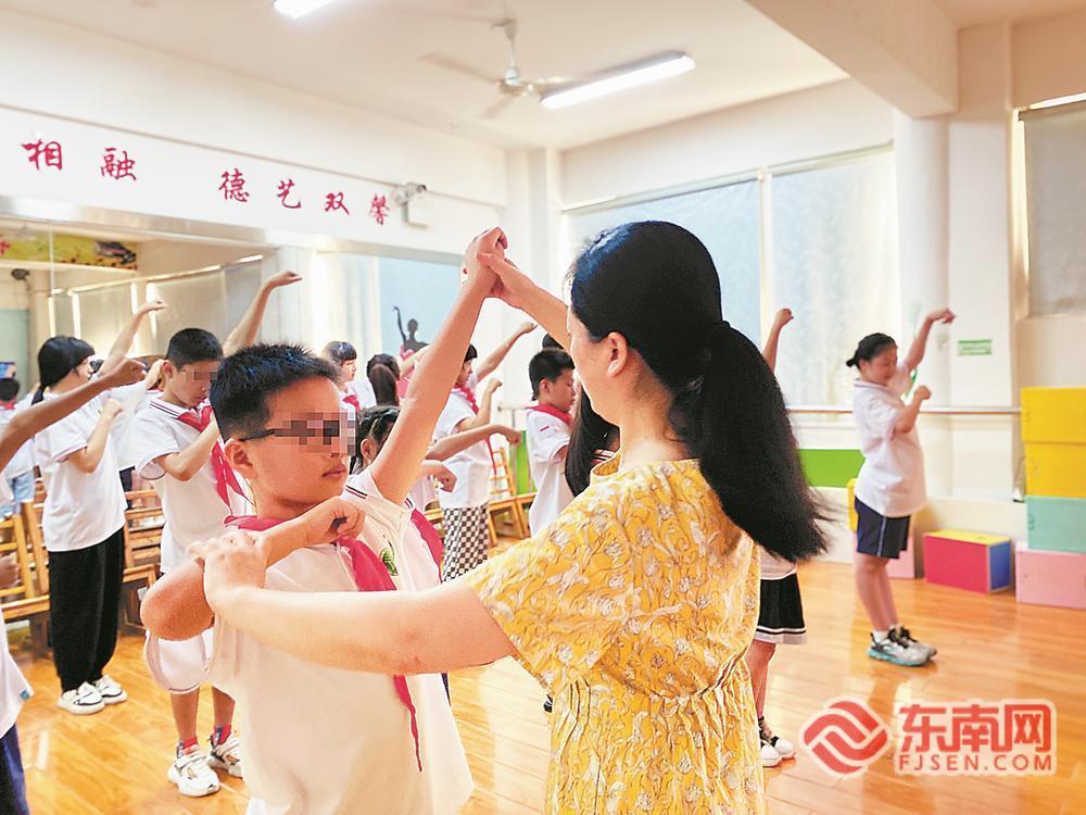 每周三下午,郭英萍(右一)到霞浦特教校指导学生舞蹈动作。王秀丽 摄