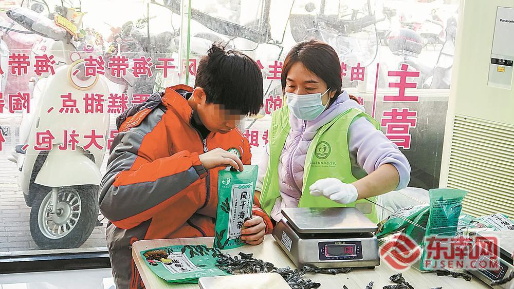 16岁的小强(化名)瘦瘦高高的,眼神格外专注。他拿起一包海带,轻声数着:“1、2、3……10。”然后小心翼翼地将10小包放入大袋,再放上电子秤——580克,“刚刚好”。他嘴角微微扬起,像完成了一件了不起的大事。